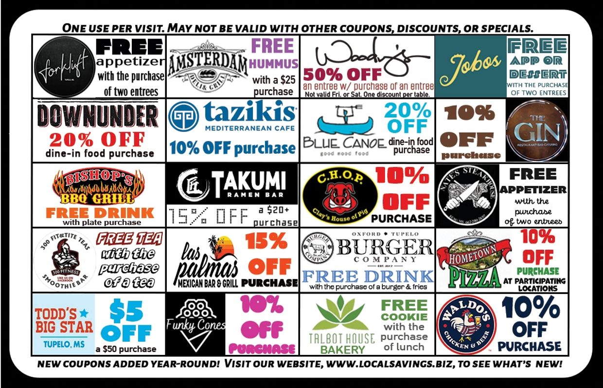 To redeem the coupons printed on the card or any of the bonus coupons not printed on the card, just show the card to the cashier at any of the participating local businesses! One coupon redemption per business, per day. These coupons cannot be combined with any other coupons, discounts or specials. Valid thru December 31, 2025.